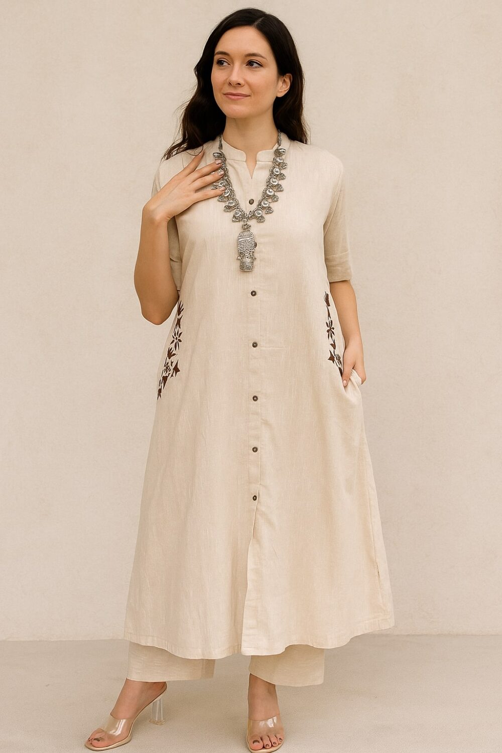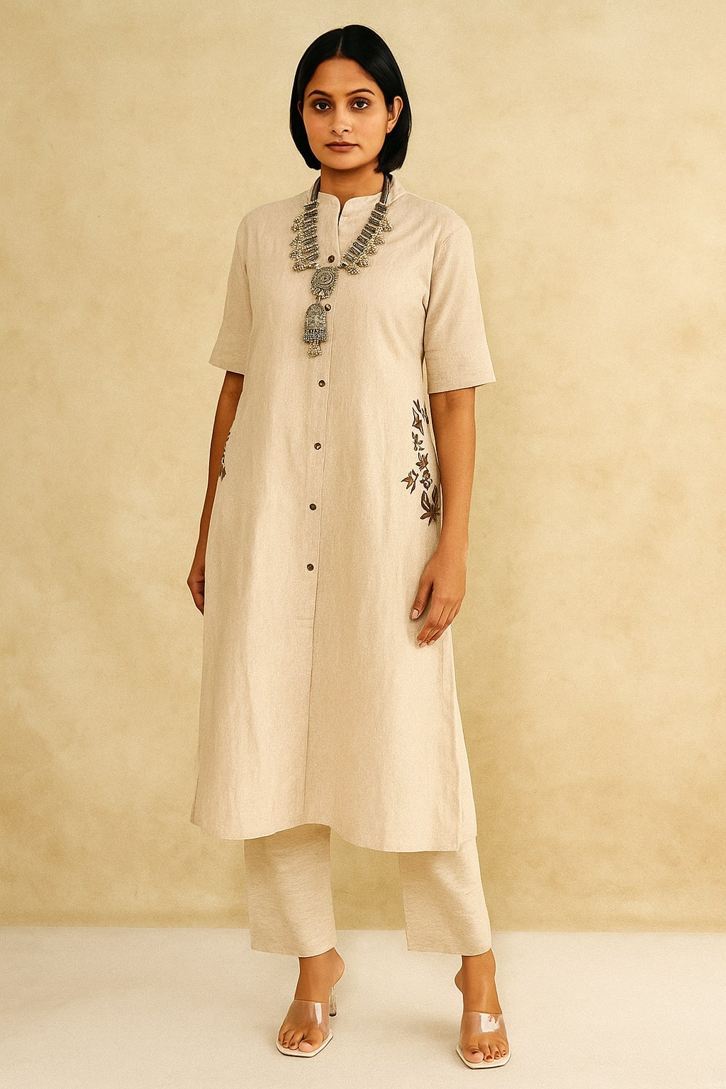 Stay cool and sophisticated this season in a breathable beige kurta set with chic button-down detailing and delicate side embroidery. Lightweight, relaxed, and perfect for sunny days, office wear, or casual outings—effortless summer elegance made easy.