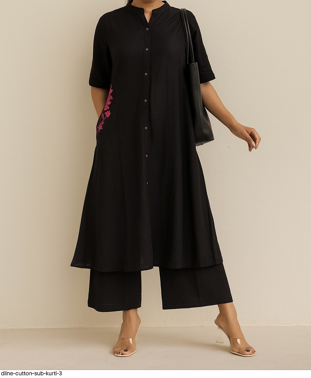 Redefine contemporary elegance with this stunning black co-ord set, thoughtfully crafted for women who appreciate style with substance. The set includes a calf-length button-down kurta with rolled sleeves and delicate side embroidery, paired with wide-legged pants for a graceful, elongated silhouette.