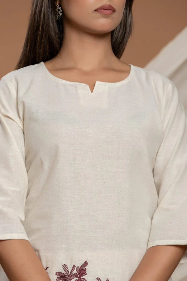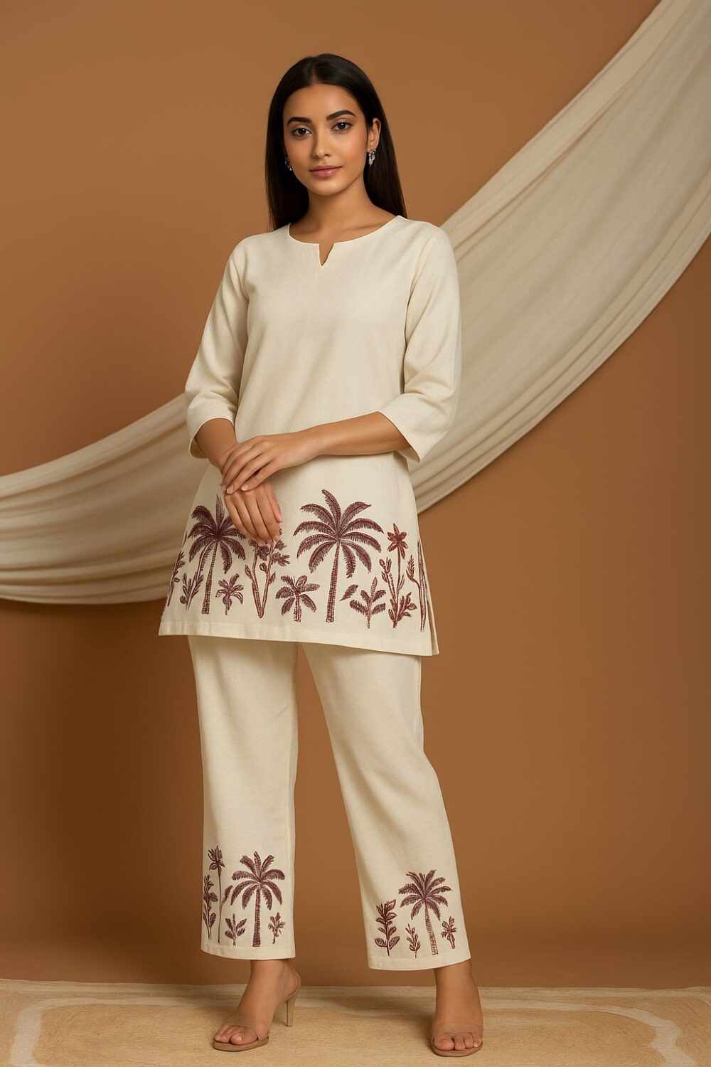 Capture easy-breezy summer style with this stunning beige co-ord set, designed for both comfort and artistry. The set features a relaxed, straight-fit kurta and matching palazzo pants, both crafted from soft, airy fabric ideal for all-day wear. What sets this ensemble apart is the striking maroon palm and tropical motif, beautifully placed at the hem of the kurta and pant legs for a creative, vacation-ready vibe.