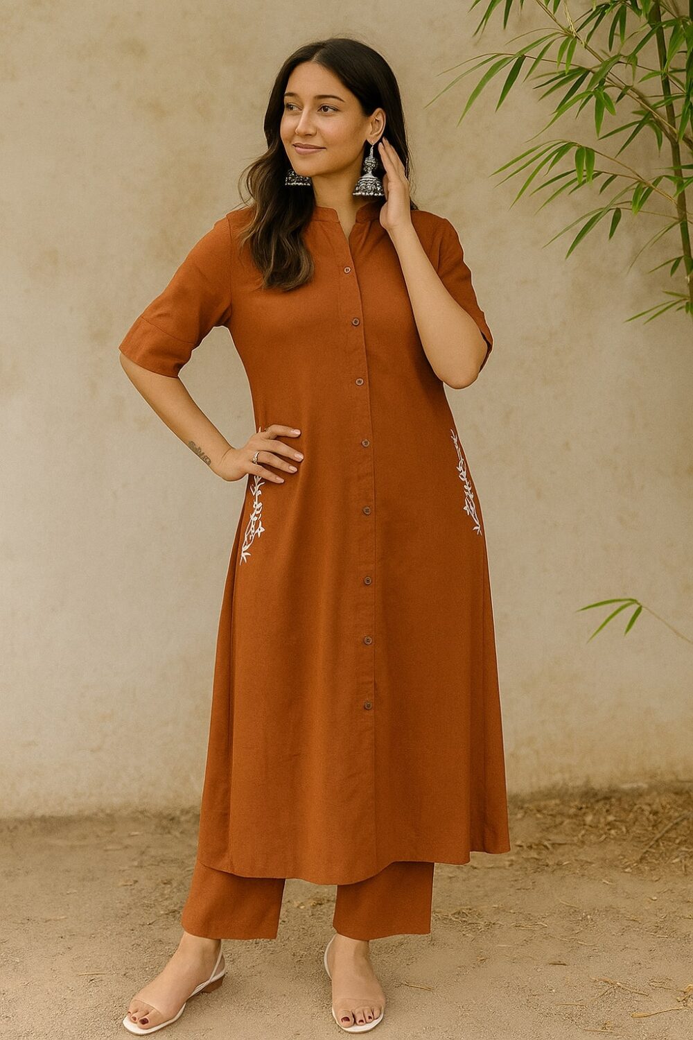 Step into effortless charm with this earthy brown co-ord set, designed to bring style and comfort to your everyday wardrobe. The set features a midi-length button-down kurta with a flattering mandarin collar and chic half sleeves, complemented by delicate white side embroidery that adds a touch of visual interest. Crafted in soft, lightweight fabric, the ensemble promises breathability and all-day ease whether you’re at work, brunch, or relaxed gatherings.